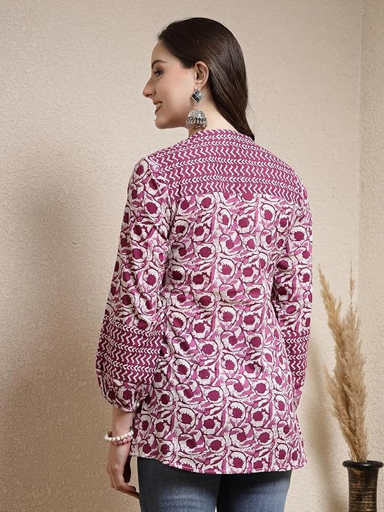 This pink printed kurti features a balanced mix of abstract and border patterns, giving it a neat and structured appearance. The front design includes a short placket and soft pleats below the chest, adding shape without compromising comfort.